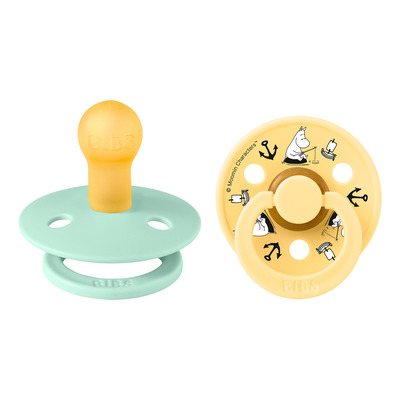 BIBS x Moomin Colour Latex er en 2-pak med sutter præget med søde mumi-figurer og sejltema