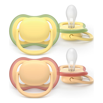 Philips Avent Sut Ultra Air 0-6 m har et skjold med ekstra store lufthuller, der lader huden ånde og holder den tør. Skjoldet og den medfølgende opbevaringsæske er lavet af 80 % plantebaseret materiale. Opbevaringsæsken fungerer som rejseetui og kan sterilisere sutterne i mikrobølgeovnen på blot 3 minutter. Pakken indeholder to sutter i farverne gul og orange.