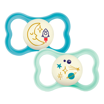 Suttens unikke MAM SkinSoft silikoneoverflade føles ekstra blød og behagelig, hvilket gør det lettere for barnet at acceptere sutten. Den ortodontiske form støtter den sunde udvikling af barnets kæbe og tænder. MAM Air Night sut har også en praktisk selvlysende funktion, der gør det nemt at finde sutten i mørke.