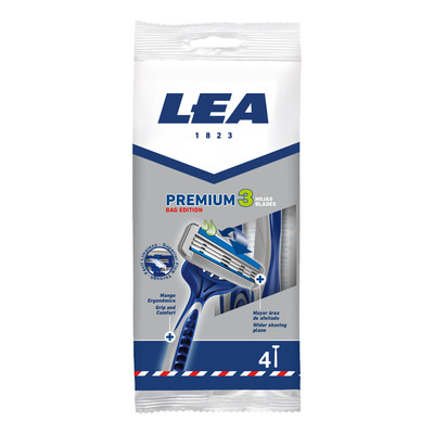 Premium 3 skraberen fra LEA er udstyret med 3 klinger, der sikrer en effektiv barbering af høj kvalitet. Skraberen har desuden en smurt strimmel beriget med Allantoin, Oliven og Kamille, der giver en behagelig glidning over huden under barberingen.