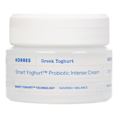 Korres Smart Yoghurt™ Probiotic Intense Cream er en rig fugtighedscreme til daglig pleje af tør og sensitiv hud. Formlen er baseret på Smart Yoghurt™-teknologi, der kombinerer ægte græsk yoghurt med præ- og probiotiske ekstrakter, havremælk og marine algenæringsstoffer. Teknologien er klinisk dokumenteret til at genoprette balancen i stresset hudmikrobiom og styrke hudbarrieren efter en uge.