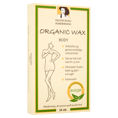 De smarte voksstrimler i Hanne Bangs økologiske voks sikrer nem, hurtig og effektiv fjernelse af uønsket hårvækst på kroppen. Hårvæksten fjernes med rode og huden efterlades helt glat og blød i op til 4-6 uger. Desuden indeholder pakken en økologisk azulenolie til plejende efterbehandling af huden. Olien fjerner eventuelle voksrester og virker kølende og beroligende på huden.