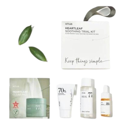 Anua Soothing Trial Kit er et komplet sæt med plejende og beroligende hudplejeprodukter med hjerteblad-ekstrakt