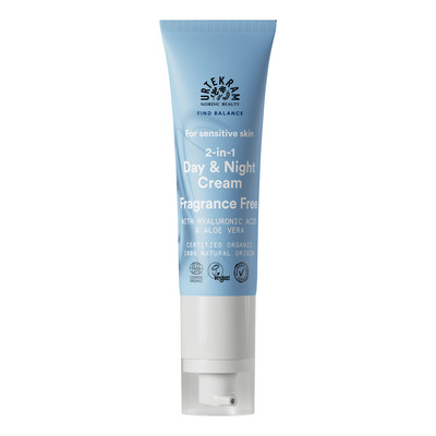 Urtekram Fragrance Free 2in1 Day & Night Cream er økologisk certificeret af Ecocert COSMOS Organic og AllergyCertified, hvilket gør den velegnet til alle hudtyper. Den er vegansk og produceret i Danmark med ingredienser af 100% naturlig oprindelse. Formlen er uden tilsat parfume, hvilket gør den ideel til daglig pleje af sart hud.