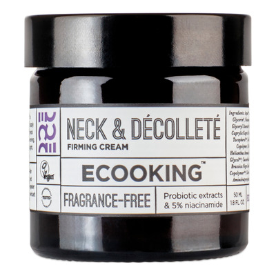 ECOOKING Neck & Décolleté Firming Cream Fragrance-free er en effektiv specialcreme uden tilsat parfume, udviklet til hals og bryst. Kliniske tests viser synligt fastere hud på 28 dage. Cremen indeholder peptider, fermenter og 5 % niacinamid, som tilsammen styrker hudens struktur, reducerer fine linjer og øger elasticitet i huden. Et patenteret tripeptid stimulerer hudens egen produktion af hyaluronsyre og giver huden fylde og fugt i dybden.