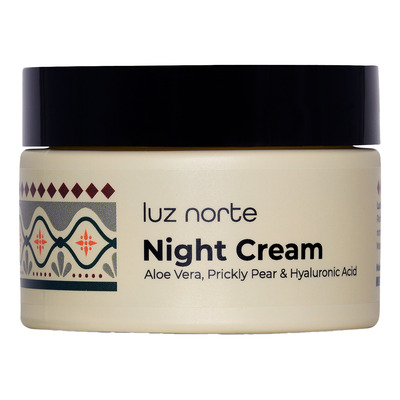 Luz Norte Natcreme er en rig og mild natcreme udviklet til at genopbygge og fugte huden natten over. Den er baseret på økologisk aloe vera og tilsat hyaluronsyre, som binder fugt i huden og hjælper med at udglatte fine linjer. Prickly pear og planteolier tilfører antioxidanter og næring, der styrker hudens barriere og elasticitet. Cremen har en blød konsistens, som smelter ind i huden og efterlader den blød, næret og fugtmættet.
