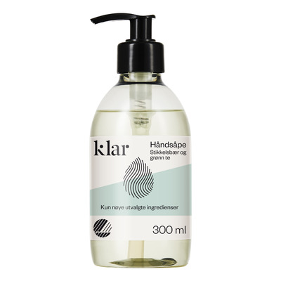 Klar Håndsæbe har en mild duft af stikkelsbær og grøn te. Alle rengøringsmidlerne fra Klar bliver produceret i Danmark med energi fra vindmøller, og flaskerne er lavet af 100% genanvendt plastik.