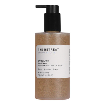 The Retreat Exfoliating Hand Wash er en 90% naturlig håndsæbe, der renser, eksfolierer og blødgør hænderne i én arbejdsgang. Formlen indeholder naturligt finmalet pimpsten, som blidt og effektivt fjerner døde hudceller, samt aloe vera og kamilleekstrakt, der beroliger og plejer huden under vask. Sæben er certificeret af Ecocert Greenlife, vegansk og dermatologisk testet.