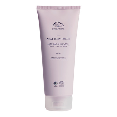 Açai Body Scrub har en ravfarvet, gelagtig tekstur, der nemt fordeles på kroppen og forvandles til en plejende lotion ved afskylning. Den naturlige signaturduft fra Rudolph Care sammen med duften fra ingredienserne gør oplevelsen behagelig og aromatisk. Certificeret med Svanemærket og COSMOS.