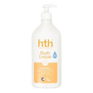 HTH Original Body Lotion med 10% karbamid er en nærende og fugtgivende hudlotion til tør og ekstra tør hud. Lotionen indeholder hudens egne fugtgivende stoffer: karbamid, mælkesyre og betain, som alle virker fugtbindende og findes naturligt i huden. Disse stoffer binder effektivt fugt til huden og hjælper den med at bevare sin naturlige beskyttelse og smidighed.