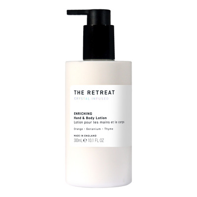 The Retreat Enriching Hand & Body Lotion er en 97% naturlig lotion med en letvægtskonsistens, der giver fugt og pleje til huden i 24 timer. Formlen er beriget med sheasmør og solsikkeolie samt marulaolie, havtornolie og sort havreekstrakt, der styrker hudens evne til at bevare fugt. Beroligende kamilleekstrakt og E-vitamin er ligeledes tilsat.