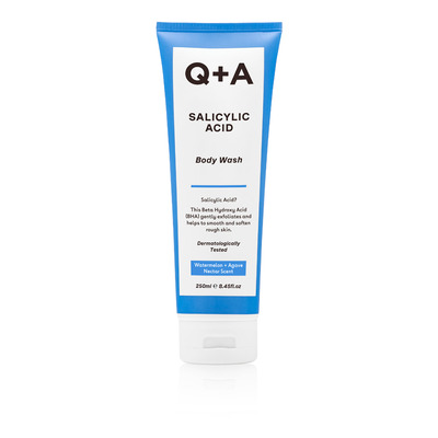 Q+A Salicylic Acid Body Wash er en kropssæbe med salicylsyre, der effektivt eksfolierer og forbedrer hudens tekstur. Formlen kombinerer salicylsyre, grøn te og pilebarkekstrakt, som renser og fjerner døde hudceller, samtidig med at den beroliger og beskytter huden. Med en sød duft af vandmelon og agavenektar tilbyder produktet en forfriskende og luksuriøs oplevelse.