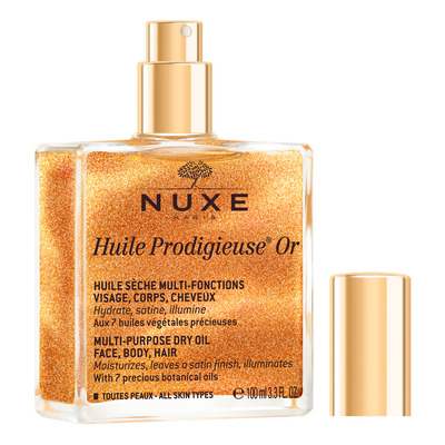 Nuxe Huile Prodigieuse OR er en glitrende tørolie med syv planteolier og naturlig shimmer til ansigt, hår og krop