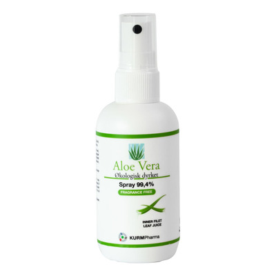 Spray Kurm Pharma Aloe Vera Spray 99,4% direkte på huden 2-3 gange dagligt eller efter behov. Kan anvendes både i ansigtet og på kroppen.