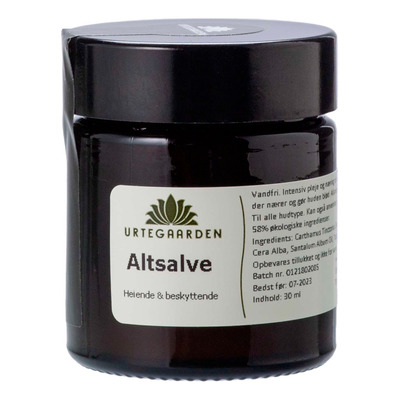 Urtegaarden Altsalve er en drøj og beskyttende vandfri salve med et højt indhold af essentielle fedtsyrer, der nærer og gør huden blød.