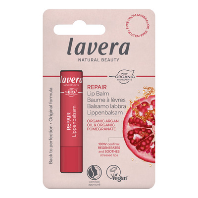 Laveras Repair er baseret på helt naturlige og økologiske ingredienser, som virker regenererende på cellerne, så huden fornyes og holdes sund. Disse egenskaber får den blandt andet fra granatæble, som er super rigt på næring og naturligt aktive stoffer. Pomaden er også tilsat Arganolie for at mætte i de dybe lag, så læberne holdes godt fugtige og hverken revner eller sprækker.