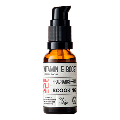 Ecooking har videreudviklet deres originale Vitamin Boost, og resultatet er dette effektive serum, som indeholder en endnu højere koncentration af vitamin E. Serummet plejer din hud med fugtgivende aktiver såsom nærende olier fra shea og hvedekim, mens vitaminets antioxidante egenskaber hjælper med at beskytte din hud fra stress udefra og tidlig aldring. Udover at beskytte bidrager E-vitamin også til at berolige og lindre samt regenerere huden, så den holdes sund og i balance.