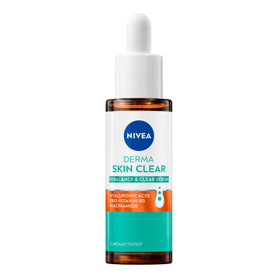 Nivea Derma Skin Clear Serum er udviklet til at berolige og fugte stresset hud, samtidig med at det reducerer ujævnheder. Serummet indeholder hyaluronsyre, der intensivt fugter huden, Pro-Vitamin B5, som hjælper med at reparere, og niacinamid, der mindsker urenheder og synligheden af porer. Resultatet er en sundere hud med en forbedret modstandsdygtighed og en naturlig glød.