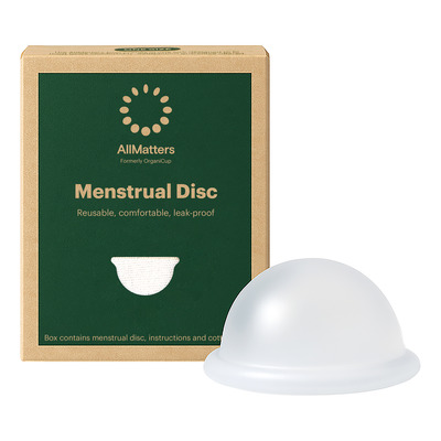 AllMatters Menstruationsdisk er fremstillet af blødt medicinsk silikone og er et genanvendeligt alternativ til bind og tamponer. Den har en kapacitet på 50 ml., hvilket svarer til seks tamponer. Disken er designet til at sidde bag kønsbenet og kan bæres i op til 12 timer ad gangen. Den passer til både høj og lav livmoderhals samt er ideel for personer med svag bækkenbund eller blærefølsomhed.