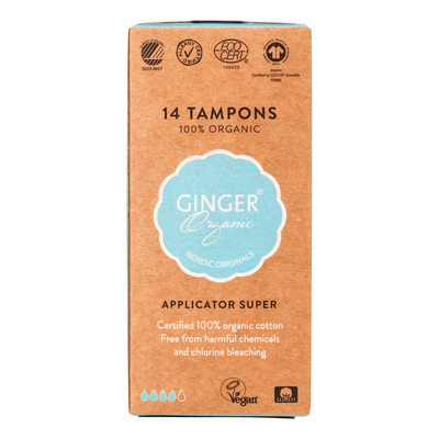 Ginger Organic tamponer er som konventionelle tamponer, - komfortable og nemme at bruge. Tampon er i 100% certificeret økologisk bomuld - det samme er snoren. Disse tamponer har super absorbering. Derudover kommer GingerOrganic tamponer i en slim-designet æske, lige til at komme i håndtasken!