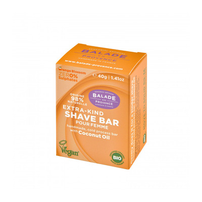Extra-Kind Shaving Bar fra Balade en Provence er en håndlavet sæbebar designet specielt til at sikre dig en tæt og behagelig barbering. Den er baseret på en kombination af sheasmør, nærende olier fra kokos, vindruekerner og ricinus. Derudover har den en mild, frisk duft af appelsinblomst. Sæben er drøj i brug samt certificeret vegansk.