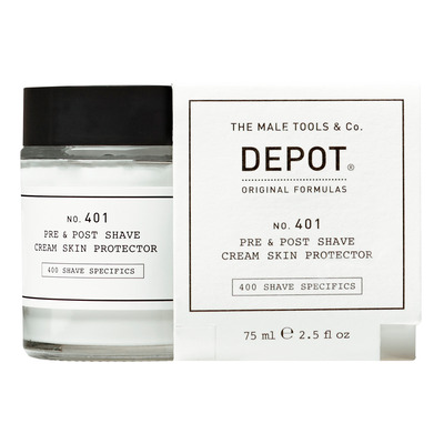 Depot 401 Pre & Post Shave Cream Skin Protector er en beskyttende creme, der bruges før og efter barbering. Barbercremen forbereder, bevarer og beskytter huden inden barbering samt er med til at blødgøre og berolige huden efter barbering. Cremen virker forfriskende på huden efter barbering. Den kan bruges af alle skæg- og hudtyper også selv sensitiv hud.