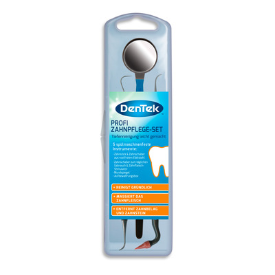 DenTek Oral Care Kit er et komplet sæt med fem tandplejeinstrumenter, der hjælper med at fjerne plak og tandbelægning samt stimulere tandkødet. Sættet inkluderer en pick og scaler i rustfrit stål til ugentlig brug, en hård plast-scaler til daglig brug, en gummistimulator samt et dugfrit tandspejl. Disse værktøjer sikrer en mere effektiv rengøring end tandbørstning og tandtråd alene.