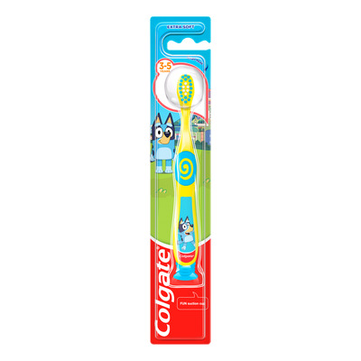 Colgate Bluey Tandbørste 3-5 år er en ekstra blød og børnevenlig tandbørste med Bluey-design og sugekop