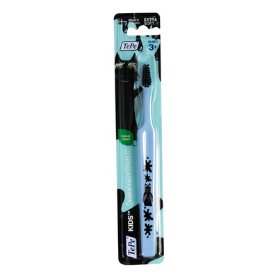 TePe Kids er en holdbar tandbørste, der anbefales til børn fra 3 år. Tandbørsten har et mindre, brugervenligt håndtag med farverige motiver, der gør børstningen sjov. Det tilspidsede børstehoved har afrundede topbørster, der sikrer en skånsom rengøring af tænder og tandkød. Tandbørstens aksel kan bøjes efter opvarmning i varmt vand, hvilket giver bedre adgang til alle tandflader. TePe Kids Summer Shadow tandbørsten er designet til at motivere børn til regelmæssig tandbørstning og opretholde en god mundsundhed.