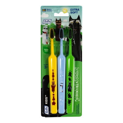 TePe Kids Tandbørste kommer i en pakke med 3 praktiske og holdbare børnetandbørster til børn fra 3 år