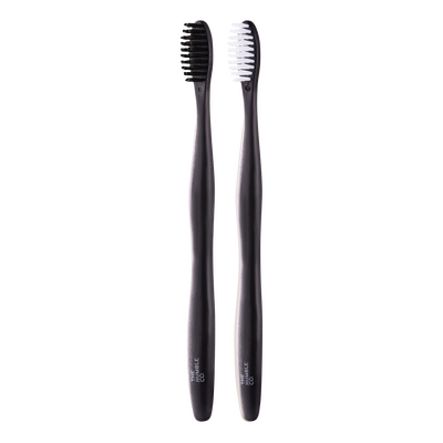 The Humble Co. Plant-based Toothbrush Soft er en pakke med to tandbørster i sort og hvid med mellembløde børstehår. Børsternes skaft er fremstillet med plantebaserede materialer, herunder hvedestivelse, og indeholder op til 45 % mindre fossil plast. Børstehårene består af BPA-fri nylon og er fremstillet med 65 % plantebaserede materialer fra ricinusbønner.