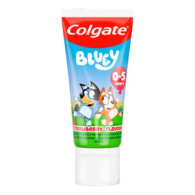 Colgate Tandpasta Bluey 0-5 år er mild tandpasta med jordbærsmag til mælketænder
