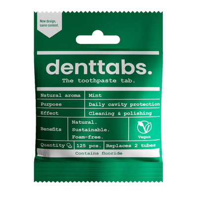 Med DENTTABS kan du passe på både dine tænder og miljøet. De smarte tandpastatabletter består udelukkende af naturlige ingredienser - herunder blandt andet af mikrokrystallinsk cellulose og natron, som har en naturlig, polerende effekt på tænderne samt naturlig mint-aroma. Denne variant indeholder desuden fluorid (1450 ppm - det samme som konventionel tandpasta), som effektivt hjælper med at beskytte tænderne mod huller og plak.