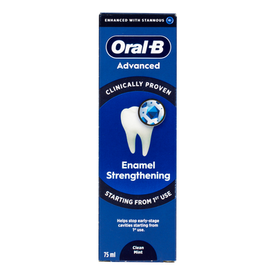 Oral-B Advanced Enamel Strengthening Tandpasta er en daglig tandpasta med stannofluoridkompleks, der danner et mikroforseglende lag, som beskytter tænderne mod mineraltab. Den er klinisk dokumenteret til at hjælpe med at stoppe begyndende huller allerede fra første brug. Tandpastaen er velegnet til dig, der ønsker stærkere emalje og beskyttelse gennem hele dagen.