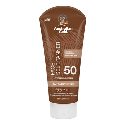 Australian Gold Face + Self tanner Lotion Sunscreen SPF50 giver en gylden farve til ansigtet og beskytter mod solen