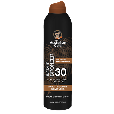 Australian Gold Instant Bronzer Continuous Spray SPF30 giver øjeblikkelig glød og nem 360° påføring