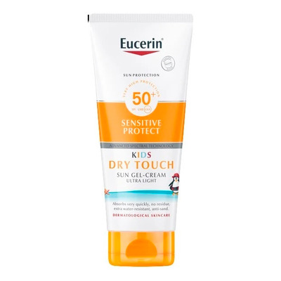 Eucerin Sun Kids Dry Touch Gel-Cream SPF50+ er en solcreme designet til at beskytte børns sensitive hud mod skadelige UVA- og UVB-stråler. Den indeholder Licochalcone A, en antioxidant og antiinflammatorisk ingrediens, der beroliger huden og beskytter den mod skader forårsaget af frie radikaler. Glycyrrhetinsyre understøtter hudens egen DNA-reparationsmekanisme, hvilket reducerer risikoen for langsigtede skader. Cremen er velegnet til babyer fra 3 måneder og er udviklet specielt til sensitiv hud.
