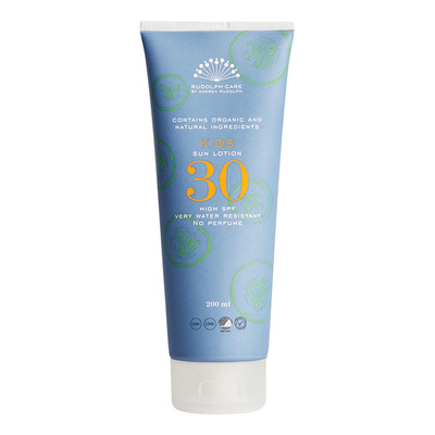Rudolph Care Sun Kids Lotion SPF30 er en vandafvisende sollotion, der beskytter dit barns hud mod solens skadelige UVA- og UVB-stråler. Kids Sun Lotion er nem at fordele og hverken klistrer, fedter eller efterlader hvide striber. Solcremen er beriget med naturlige, plejende ingredienser som agurkeekstrakt, der giver fugt og har en kølende effekt på huden, kamille, der beroliger, og rapsolie, der nærer og bevarer fugten i huden.