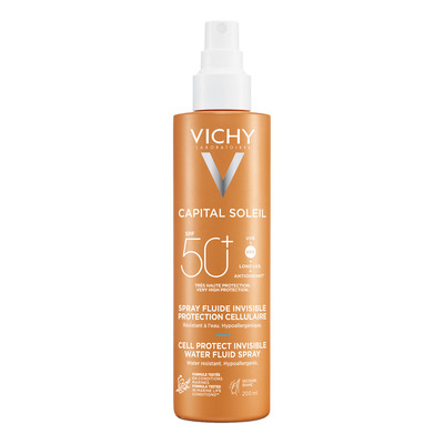 Vichy Capital Soleil Cell Protect UV Spray SPF50+ er velegnet til sensitiv hud og til både ansigt og krop. Den er lavet med netlock teknologi, som giver en bredspektret beskyttelse mod solens UVA- og UVB-stråler. Solsprayen er både vand- og sandresistent, så du ikke skal bekymre dig, når du bader eller ligger og soler dig på stranden. Den har en usynlig finish og virker ikke fedtet eller klistret på huden. Denne solspray indeholder E-vitamin, der forstærker hudens antioxidant-forsvar samt hyaluronsyre, som reducerer solens udtørrende effekt.