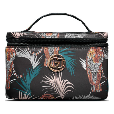 Gillian Jones beautyboks i print med sorte tigre og palmer tilbyder en elegant og funktionel opbevaringsmulighed til dine skønhedsprodukter. Denne eksklusive beautyboks er prydet med et GJ emblem i guld på fronten, hvilket tilføjer et touch af luksus. Med indbygget spejl, penselholder og en gennemsigtig lomme i låget er denne toilettaske designet til at holde dine skønhedsprodukter organiserede og let tilgængelige. Det store rum indeni giver et fremragende overblik, så du nemt kan finde, hvad du har brug for.