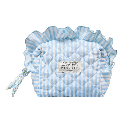 Karen Toilettaske Blå/Hvide Striber er en lille, quiltet taske i blød bomuld med lyseblå og hvide striber. Tasken er ideel til opbevaring af makeup og mindre produkter og passer perfekt til både hverdagsbrug og korte ture. Indersiden er foret med blomstret stof, som giver ekstra beskyttelse. Den lukkes med en praktisk lynlås med stofsløjfe, der er nem at gribe.