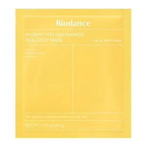 Biodance Radiant Vita Niacinamide Real Deep Mask er en intensivt fugtgivende sheet-maske, der indeholder niacinamid, glutathion og frugtvand fra ananas. Masken udjævner hudtonen og bidrager til at mindske synligheden af mørke pletter. Den har en let geltekstur, som tilpasser sig huden og sikrer optimal absorption. Niacinamid og glutathion styrker hudens udstråling og giver en jævn, glat overflade med fornyet glød.