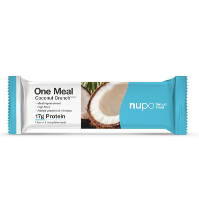 Nupo One Meal Bar Coconut Crunch er en måltidserstatningsbar til vægttab og vægtkontrol med en cremet kokossmag kombineret med sød karamel og let sprød crunch, overtrukket med mælkechokolade. Baren indeholder 17 g protein, kostfibre samt vitaminer og mineraler og leverer 207 kcal pr. bar. Den er beregnet til at erstatte et dagligt hovedmåltider som del af en energireduceret kost.