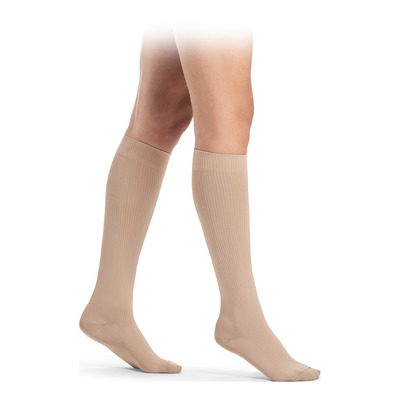 TRAVENO by Sigvaris er kompressionsstrømper i beige der forebygger hævede ben og giver komfort hele dagen